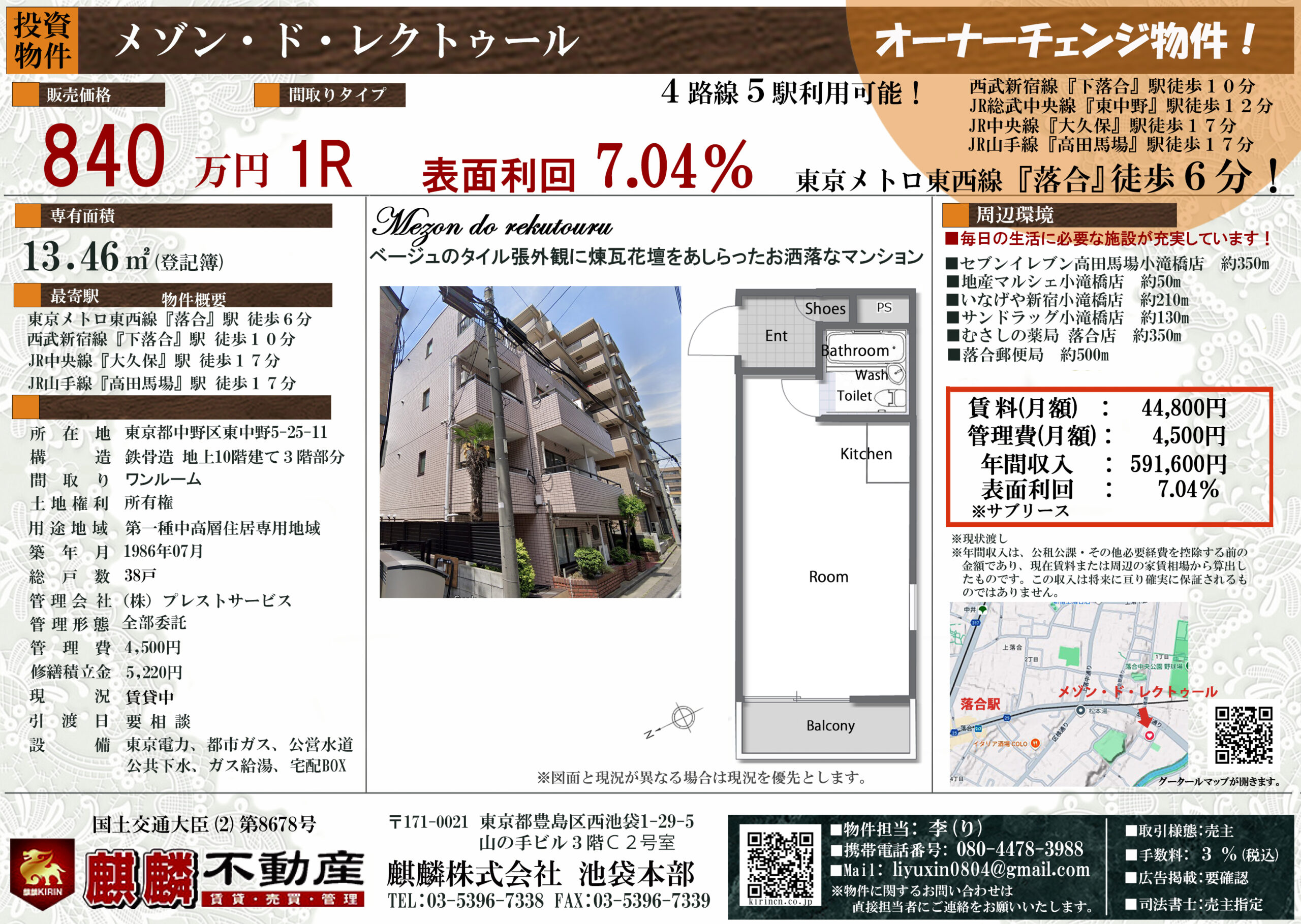 | 交通 | 東京メトロ東西線「落合」駅徒歩6分 西武新宿線「下落合」駅徒歩10分 JR中央線「大久保」駅徒歩17分 JR山手線「高田馬場」駅徒歩17分 |